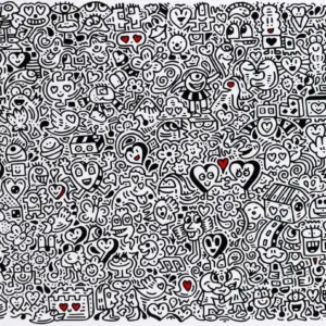 自らをMr Doodleと名乗る彼の「落書き」スタイルは、独自のペンを使った太い線で、ひとつひとつチャーミングな表情を持つキャラクターやシンボルをひたすら描き続ける。下書き無しで迷うことなく線を描き続ける姿は圧巻。